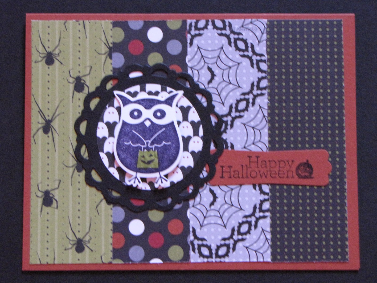 Hello everyone and Happy Sunday Halloween Eve! Aside from the fact that the DSP with the webs on it was cut the wrong way, the card is cute. Augh! What was I thinking? Sheesh! I made a set of these cards for my customer and club thank yous this month. I hardly ever use that owl punch, and it's so cute! Sera